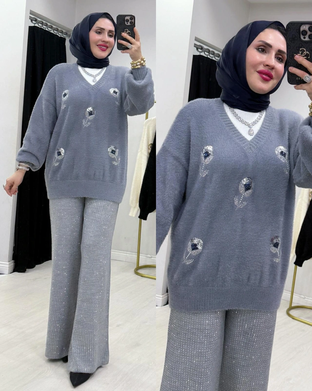 Taşlı Triko Pantolon Gri