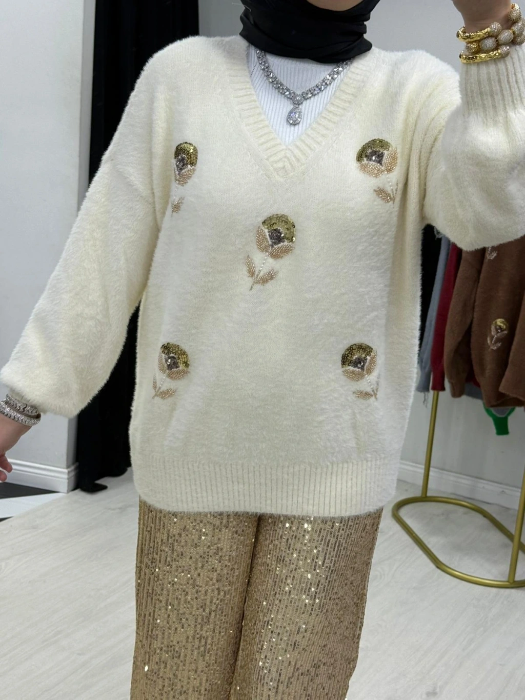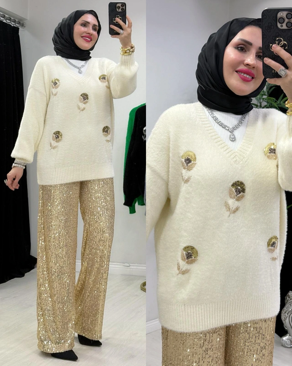 Yeni Sezon Gül Detaylı Takım Beyaz