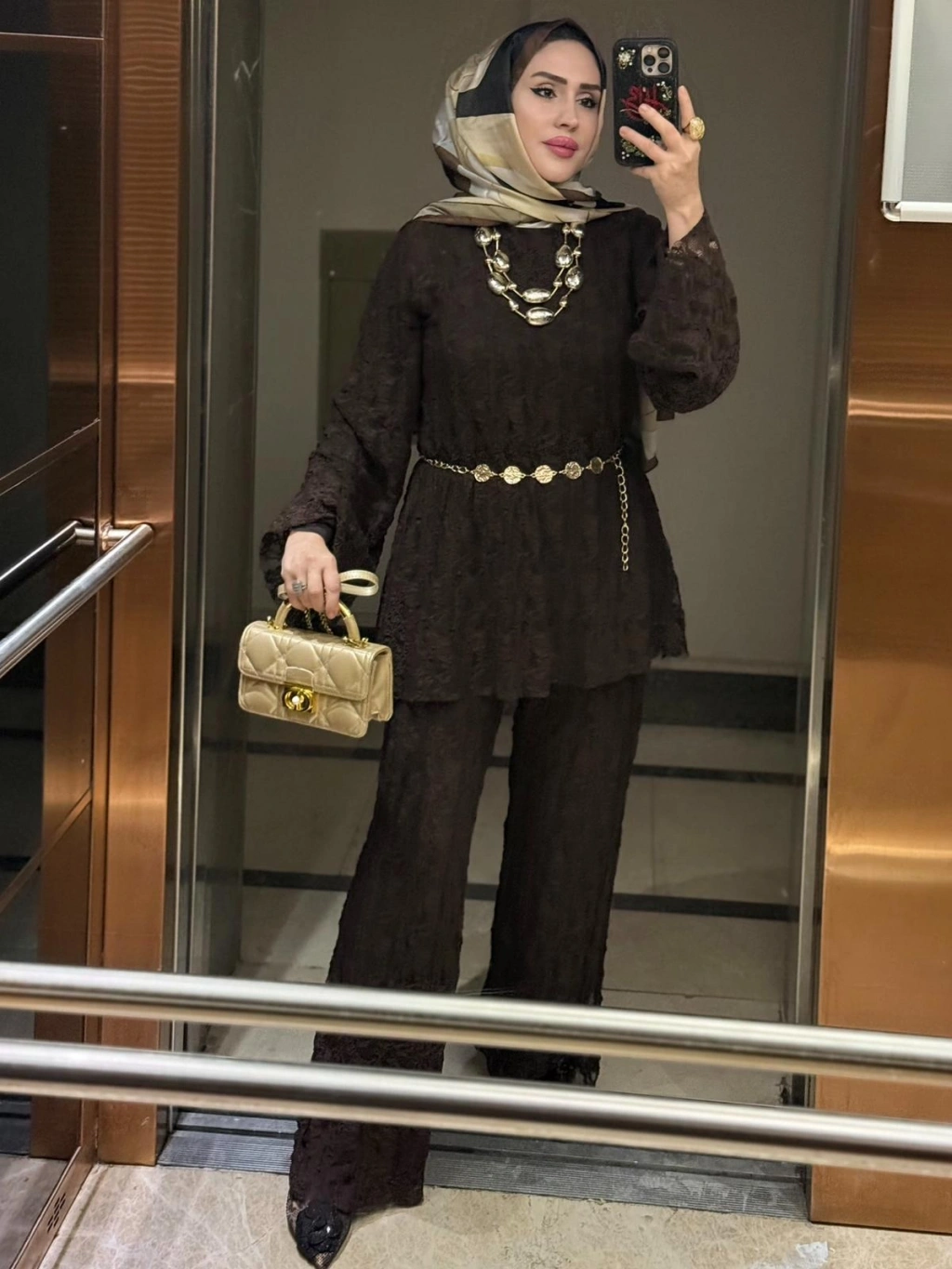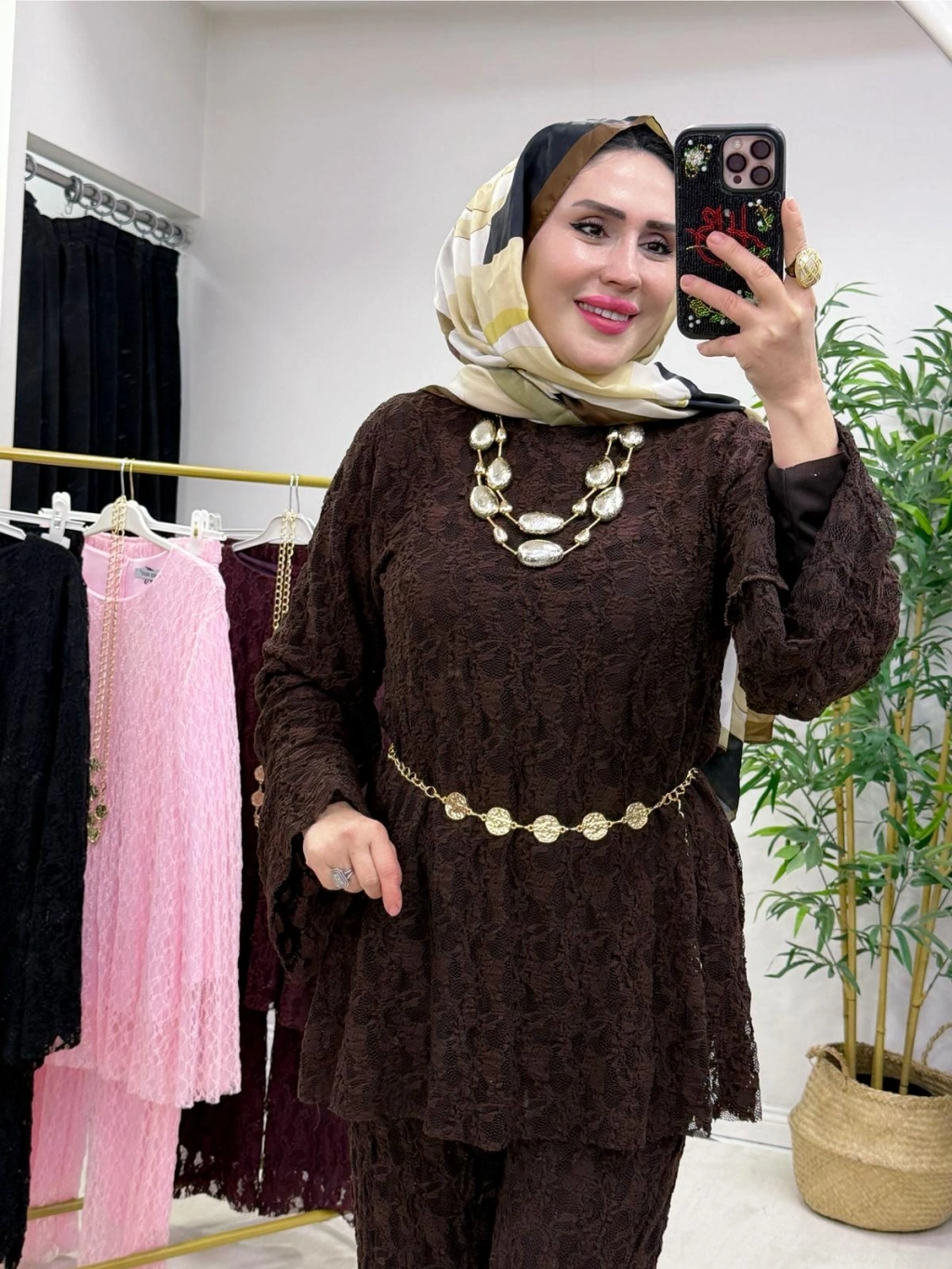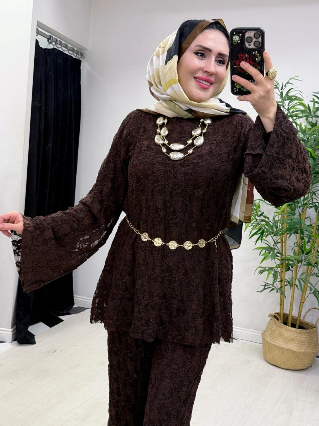 Dantel Detaylı Kemer Hediyeli Şık Takım Kahverengi