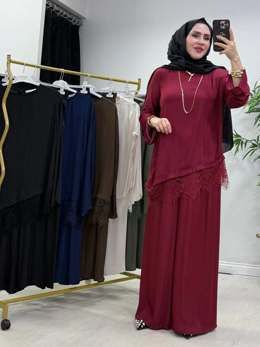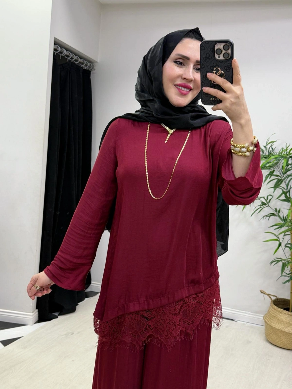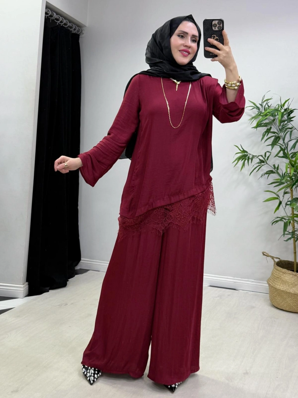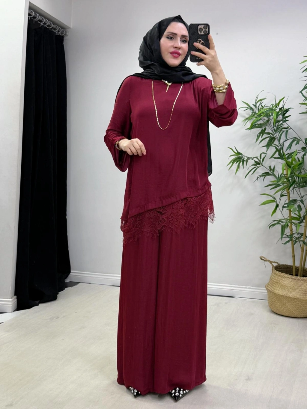 Dantel Detaylı Takım İpek Kumaş Bordo