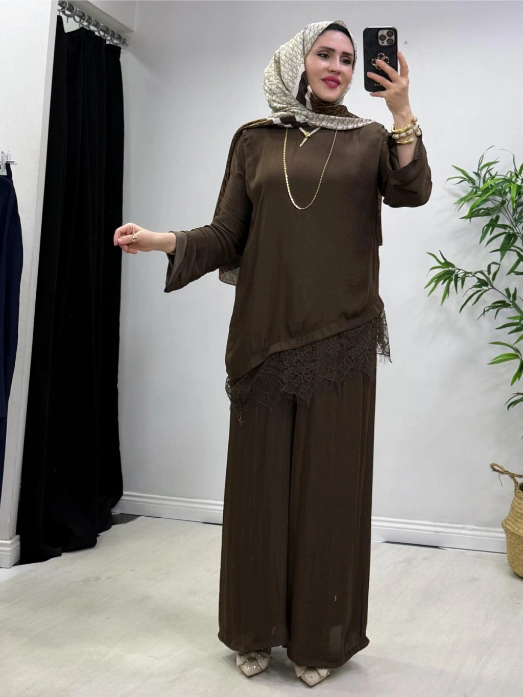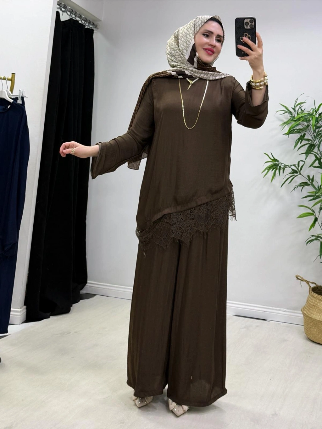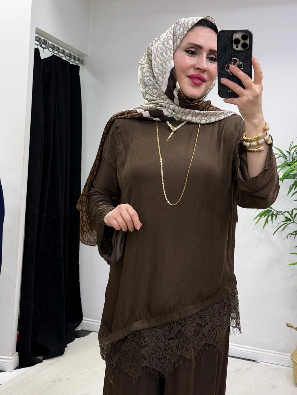 Dantel Detaylı Takım İpek Kumaş Kahverengi