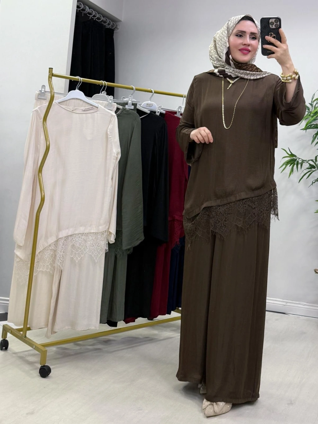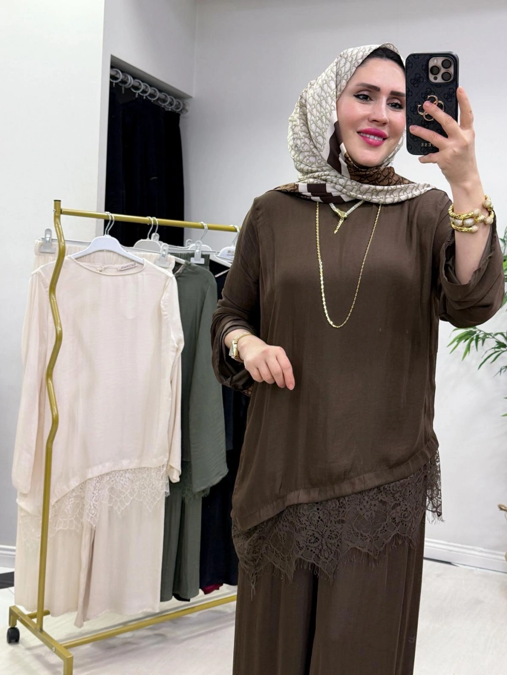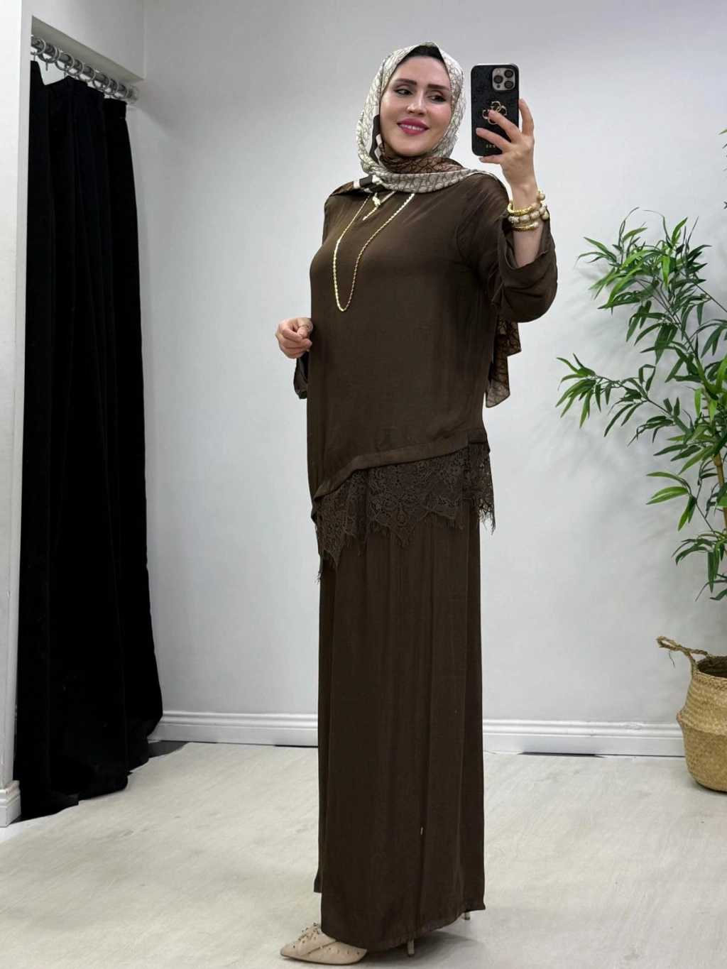 Dantel Detaylı Takım İpek Kumaş Kahverengi
