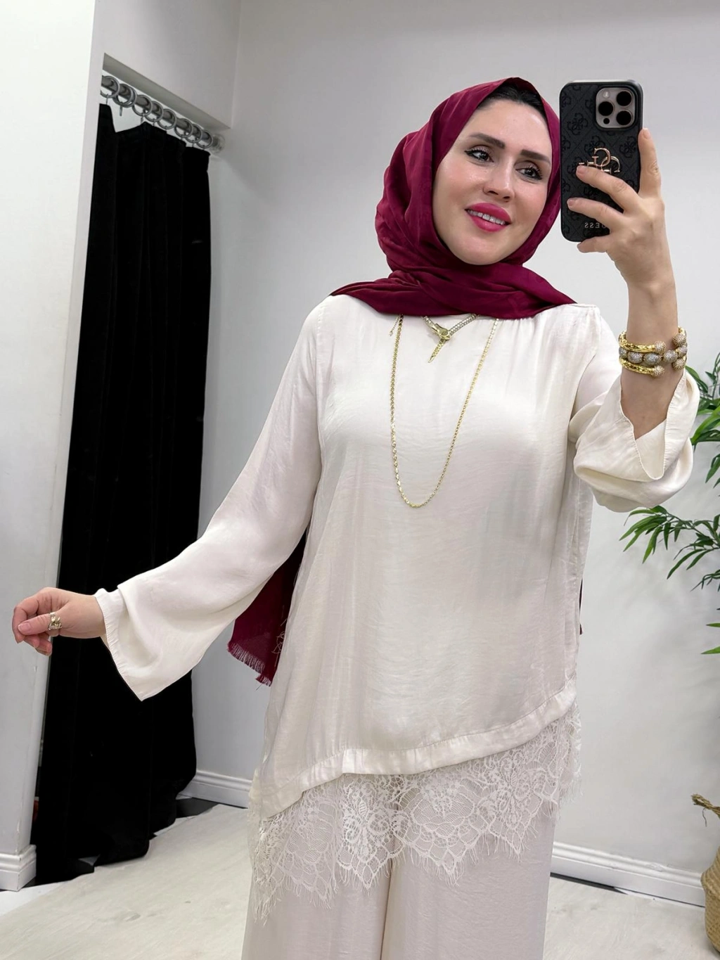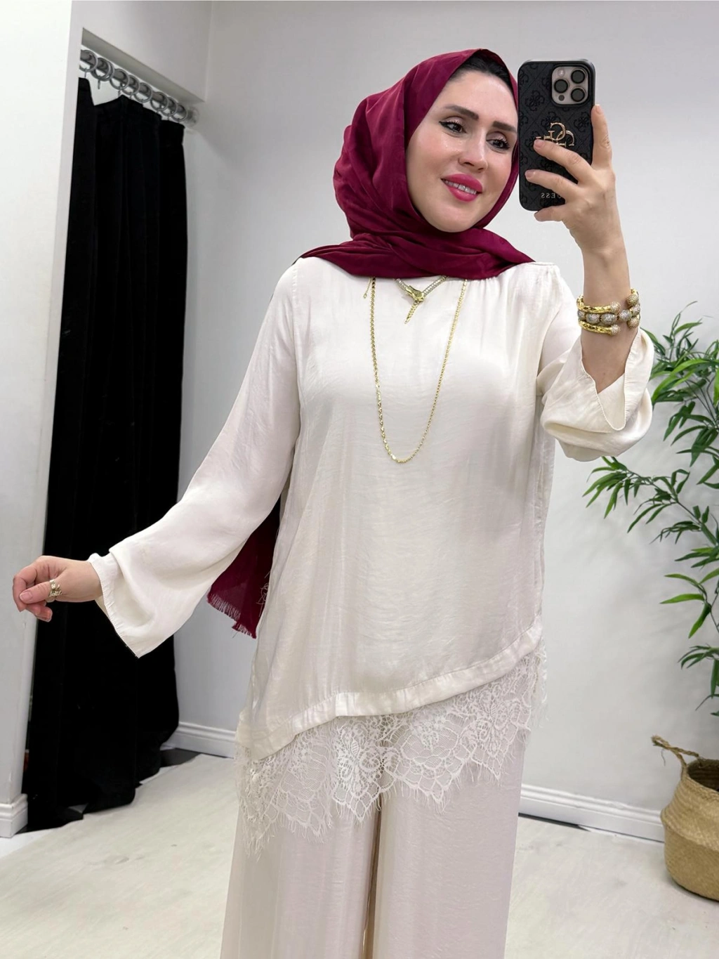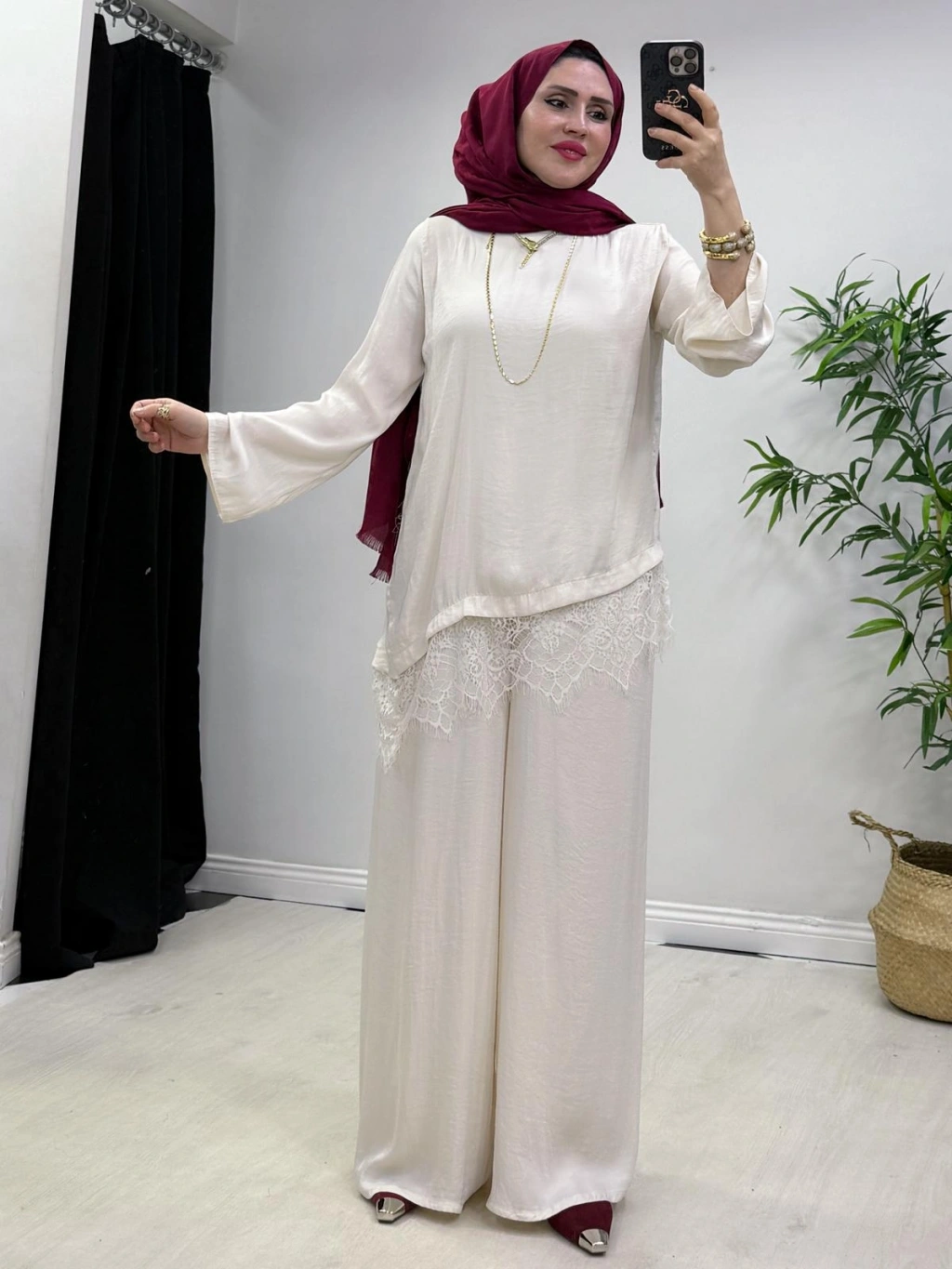 Dantel Detaylı Takım İpek Kumaş Krem