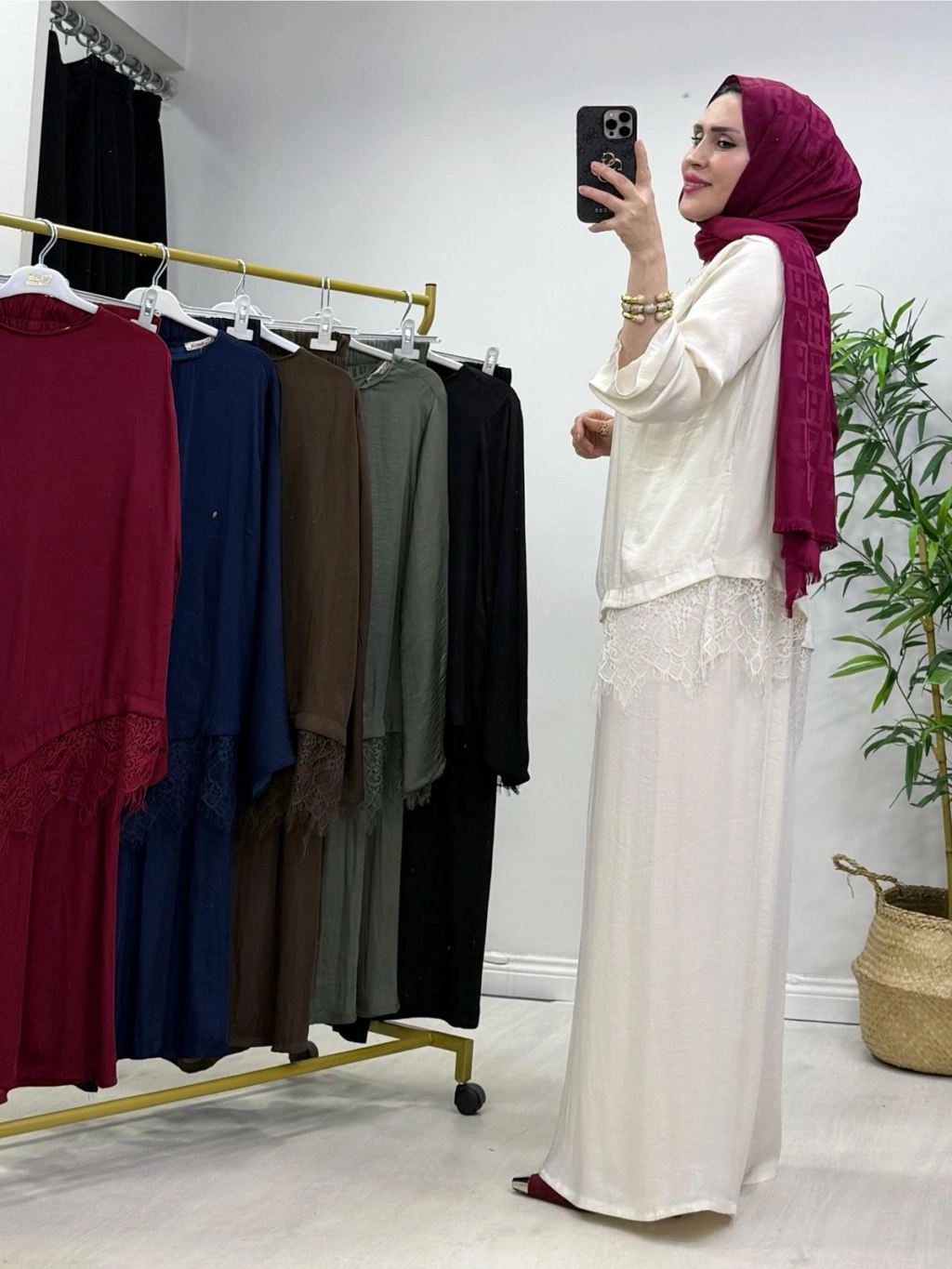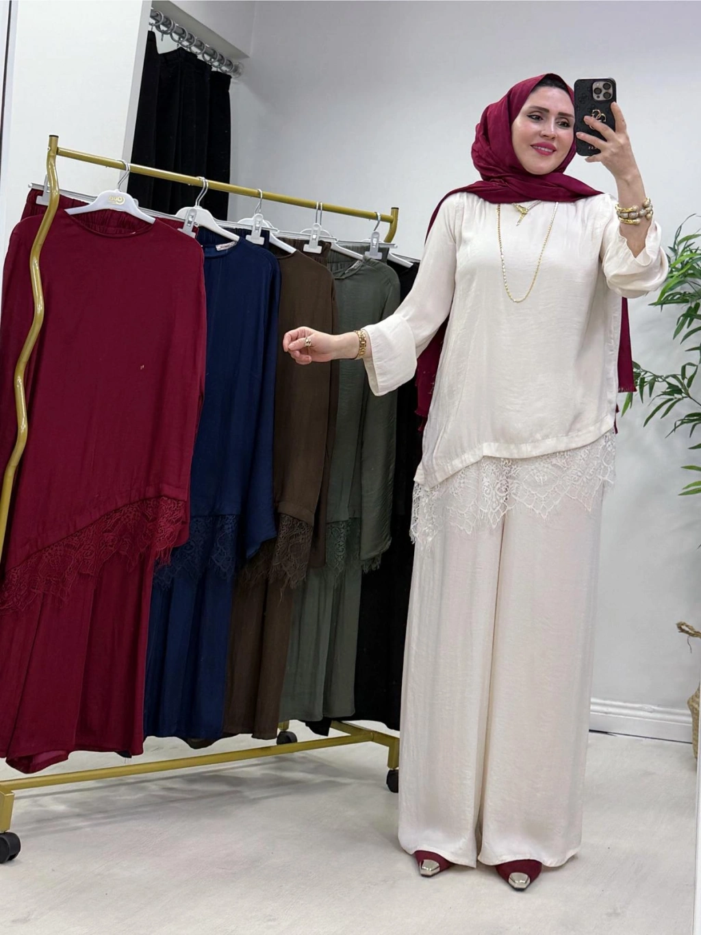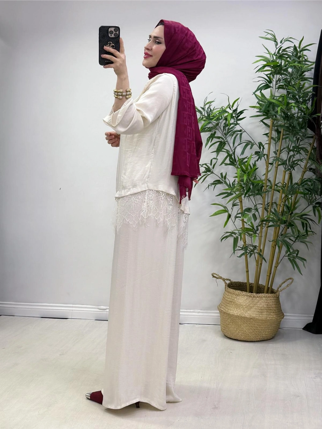 Dantel Detaylı Takım İpek Kumaş Krem