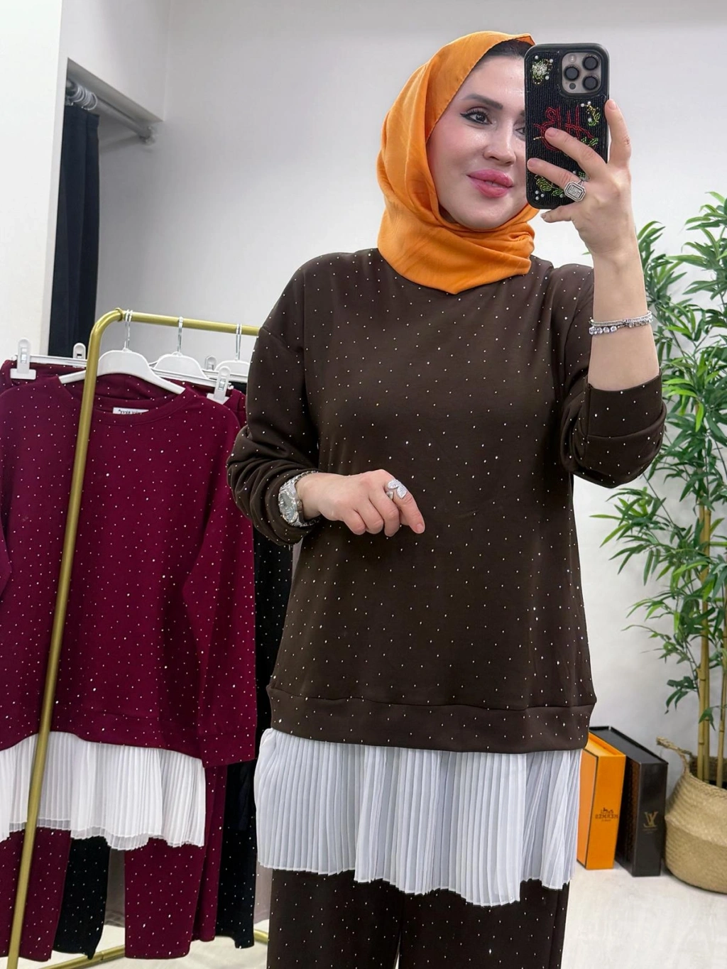 Aura Şal Detaylı Takım Kahverengi