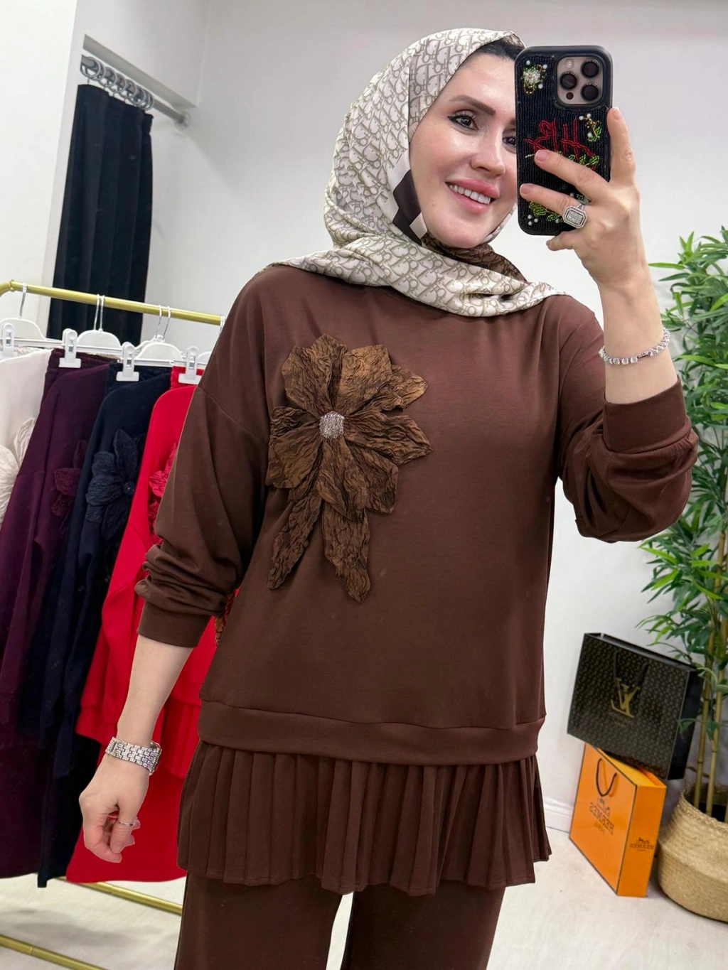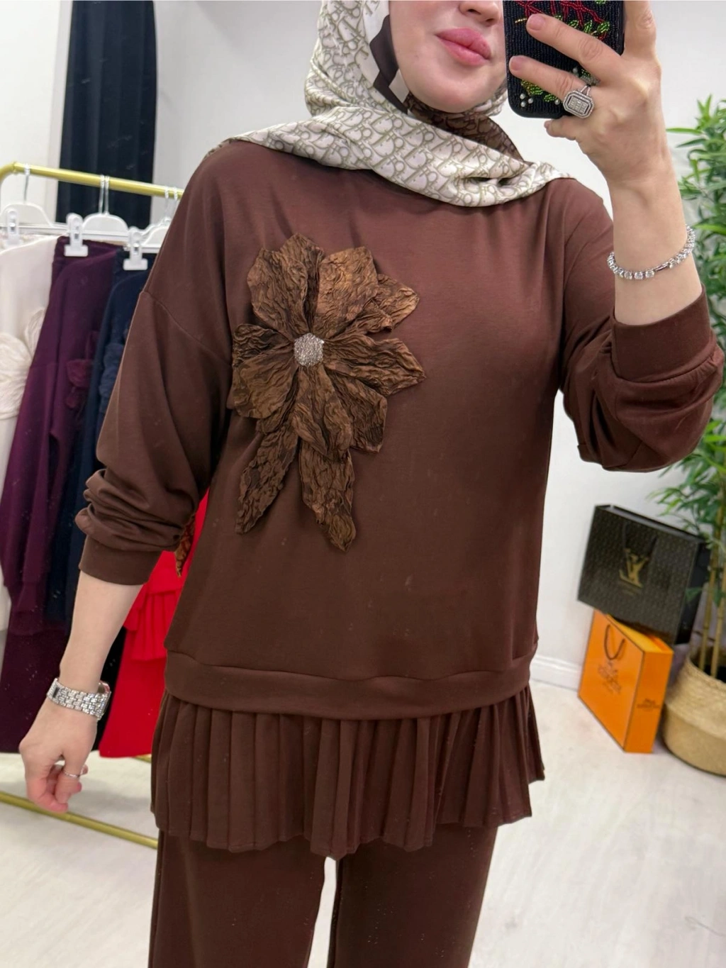 Gül Broş Detaylı Oysho Kumaş Takım Kahverengi