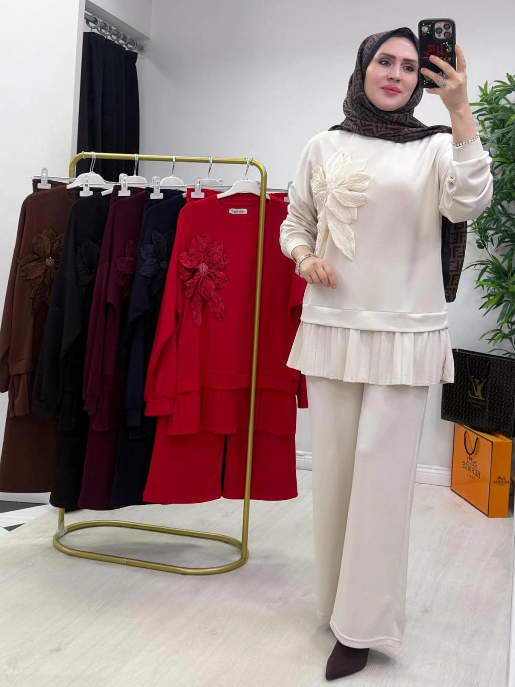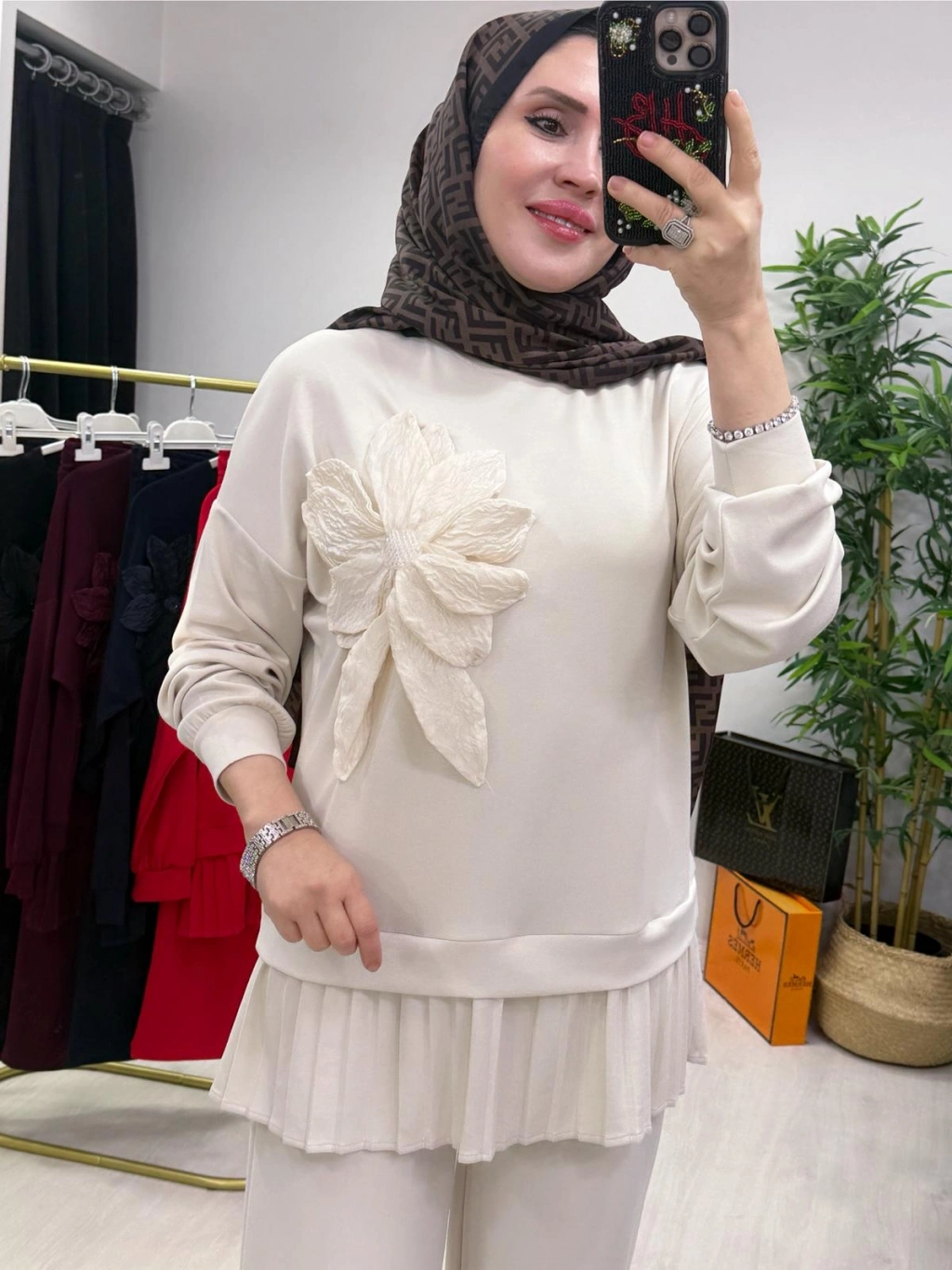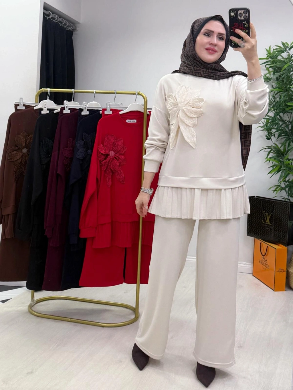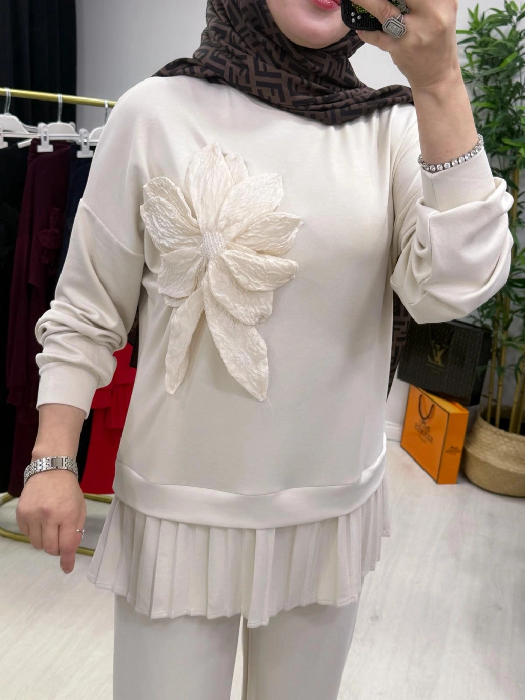 Gül Broş Detaylı Oysho Kumaş Takım Krem