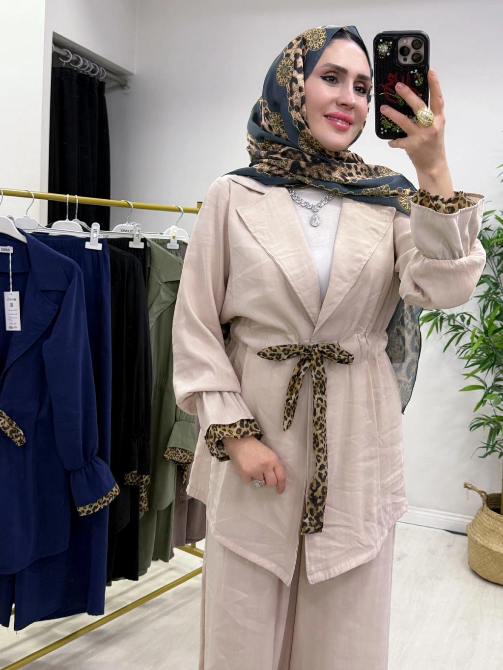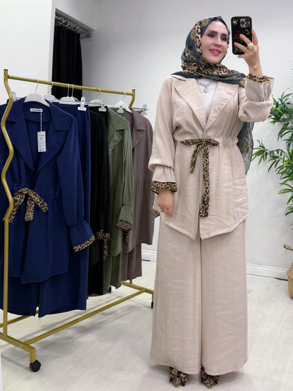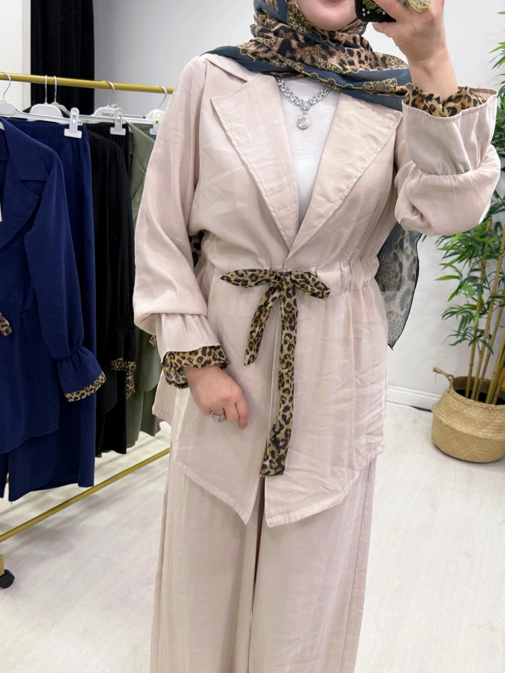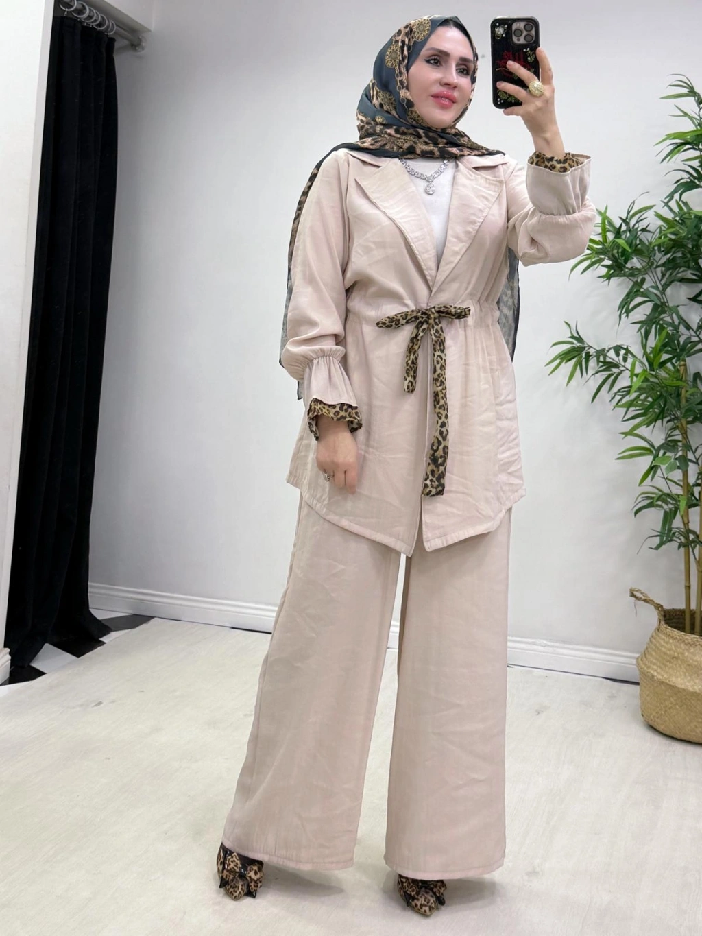Leopar Detaylı Qupra Takım Krem