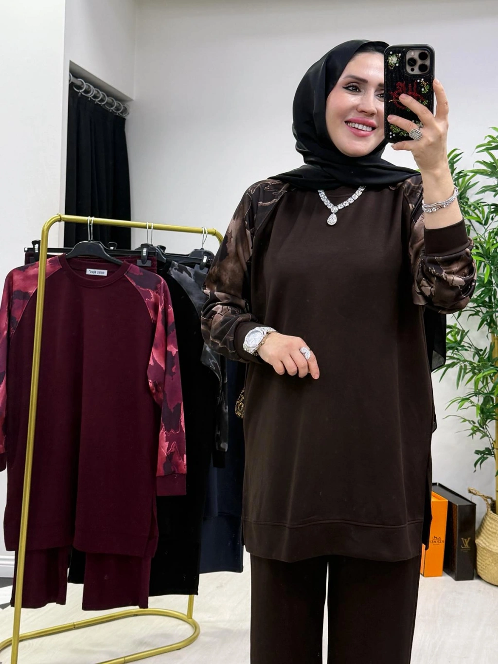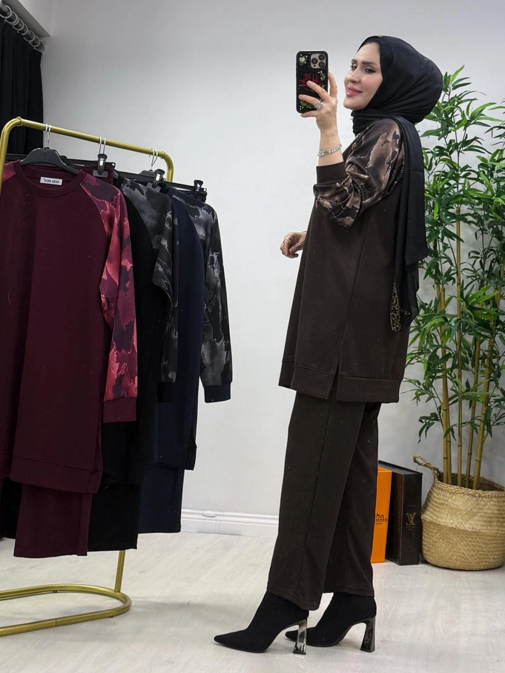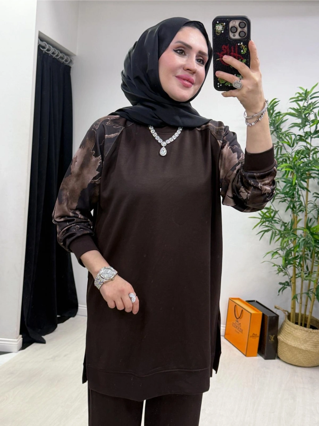 Aura Şal Detaylı Takım Kahverengi