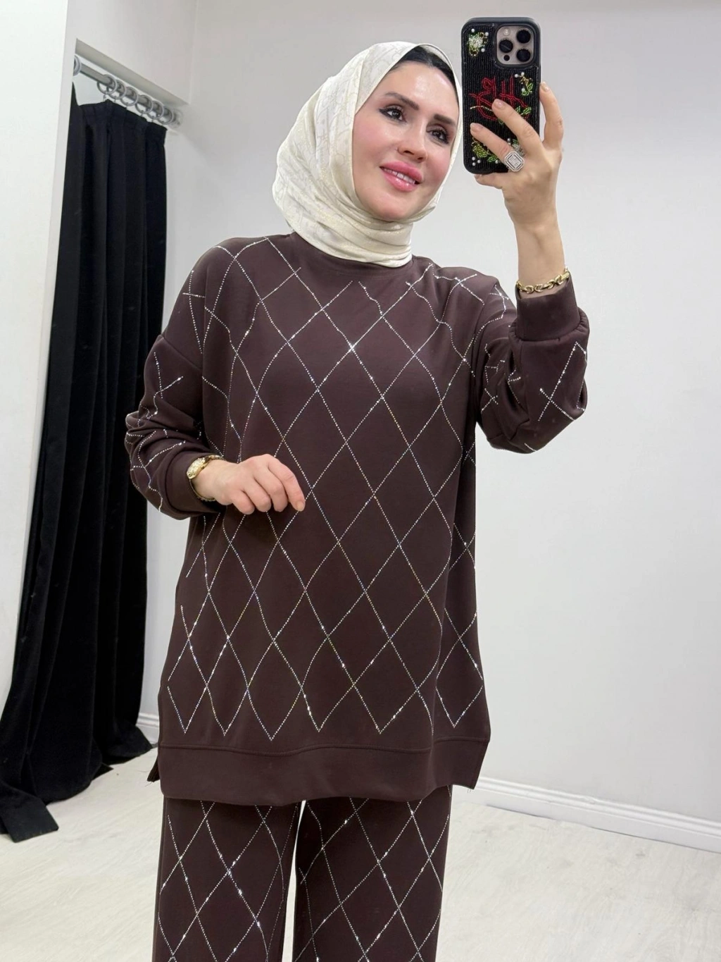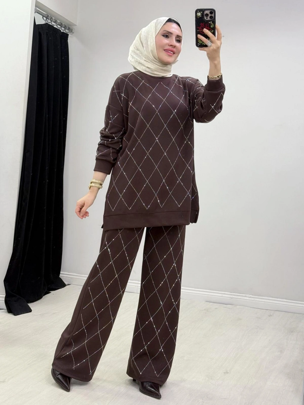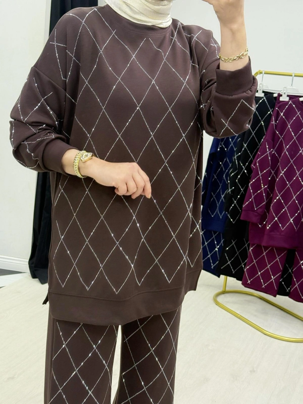 Taşlı Baklava Desen Takım Kahverengi