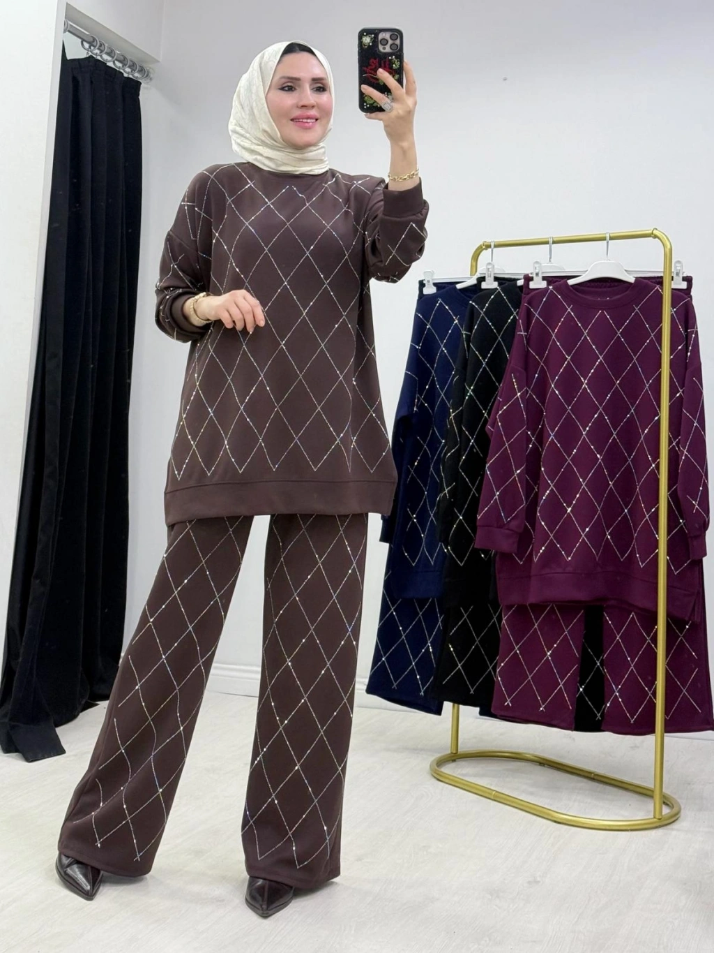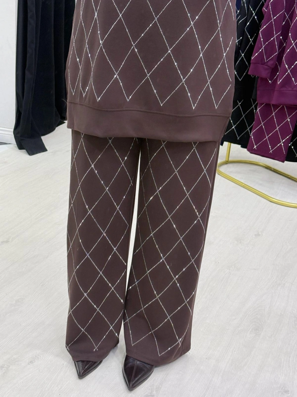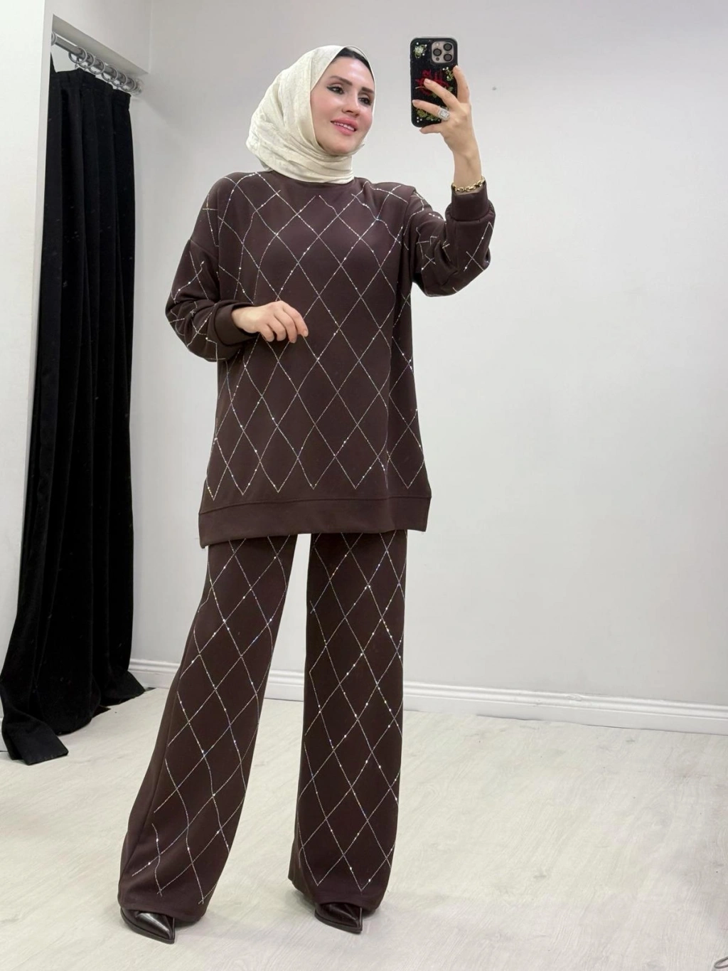 Taşlı Baklava Desen Takım Kahverengi